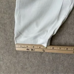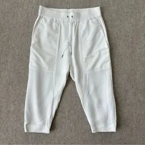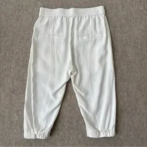 Cropped jogger pants with an elastic drawstring waist. Front patch pockets and panel seam detailing. Relaxed tapered fit for casual wear. Minimalist designer styling in clean white.