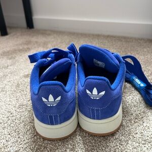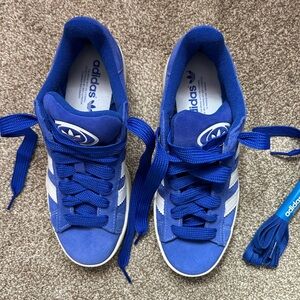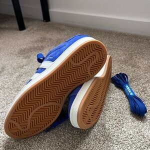 Classic low-top suede sneakers. Blue upper with white three stripes and branding. Gum-colored outsole with textured tread. Includes extra blue laces.