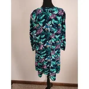 The dress features a lovely blue floral and leaf print, giving it a tropical and boho vibe. The tiered design adds a touch of elegance and sophistication. It's a size large and is in very good condition.