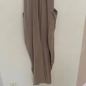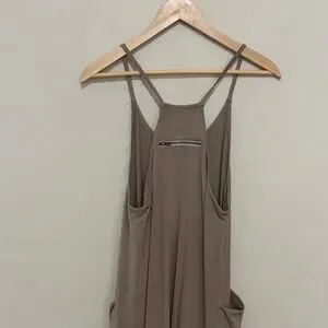 Relaxed sleeveless jumpsuit with thin straps. Soft taupe fabric and roomy side pockets. Easy, casual silhouette for everyday wear.