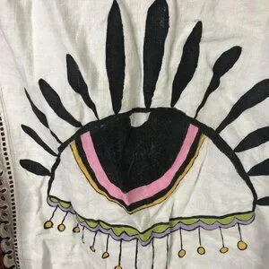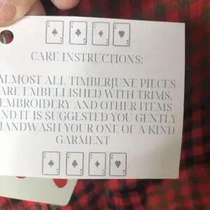 Care instructions: Wash before wear, machine wash warm with like colors, only non-chlorine bleach if needed, tumble dry low, remove promptly, and warm iron if needed per interior label; hang tag notes that most Timber June pieces are embellished and suggests gently handwashing your one-of-a-kind garment.