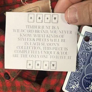 Logos and branding: Timber June playing-card style main neck label and branded hang tags including a printed "wildcard brand" story card and a separate care card.