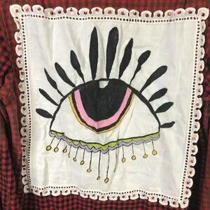 Design details: Allover red and dark check pattern, large square white back panel featuring a hand-drawn style evil eye graphic in black, pink, yellow, green, and lavender, scalloped eyelet lace border with orange sequin accents, curved shirttail hem, and decorative stitched square detail at the upper back.
