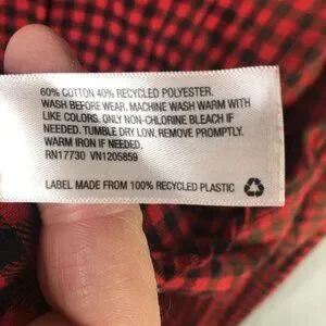 Tag information: Interior care label lists 60% cotton and 40% recycled polyester with RN# 17730 and VN# 1205859; label is made from 100% recycled plastic.