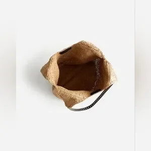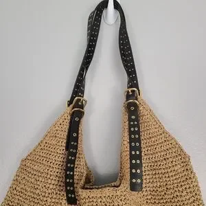 A handwoven straw tote designed to go from the beach to the bar. Featuring a slouchy shape, magnetic closure and a leather strap with grommet details for an edgy look, it's spacious enough to hold an iPad, water bottle, phone, wallet and keys.