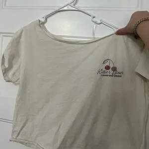 Soft cream Hollister short sleeve tee. Small cherry diner graphic at left chest. Boxy, casual fit. Lightweight cotton material. Easy everyday style.