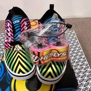 Colorful Heelys kids sneakers with bold neon stripes. Laces included and wheel set attached. Low-top skate style with cushioned collar. Eye-catching pattern for active kids.