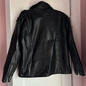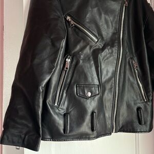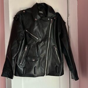 ZARA black faux leather moto jacket in a classic biker style. Features an asymmetrical front zip, multiple zip pockets, and silver-tone hardware for that edgy, structured look.