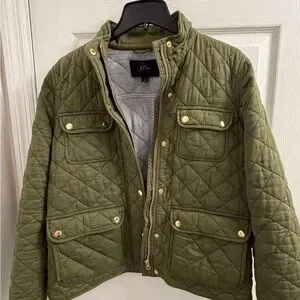 J. Crew downtown quilted field jacket in olive green. Great pre-owned condition. Button front and hidden zip closure. Size M.