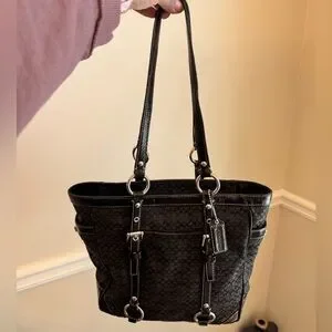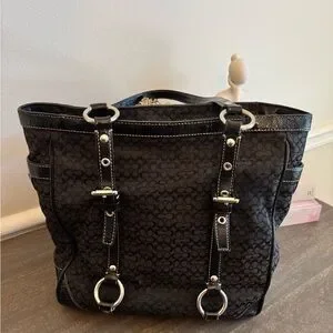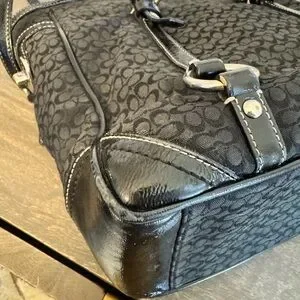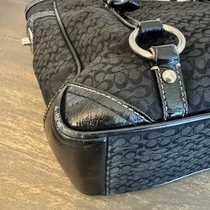 Coach gallery tote featuring the signature black jacquard weave with black patent leather trim and silver-tone hardware. Measure approximately 13” x 10” x 4” with an adjustable handle drop of about 10-11 inches. Purchased in as is condition.
