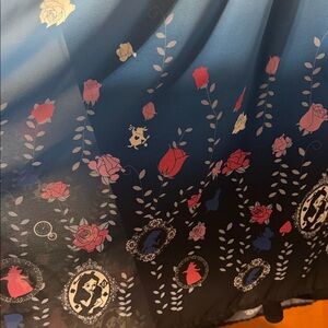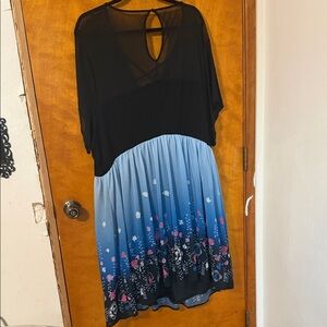 Torrid midi dress with a relaxed black bodice. Ombre blue skirt fades from light to deep blue. Floral and bandana-inspired border print along hem. Crisscross V-neck detail at the front. Easy, feminine drape.