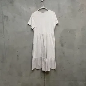 Soft white maxi with short sleeves. Pullover style with a crew neckline. Tiered skirt for gentle movement. Simple, everyday casual look.