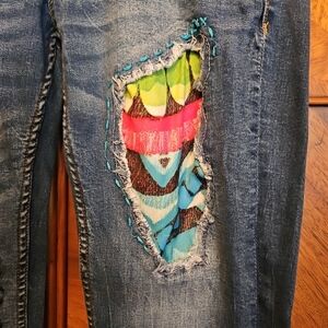 Desigual boyfriend-style jeans. Distressed details with colorful fabric patches. Embroidered accents and playful trim. Comfortable relaxed fit. Bold, artistic look.