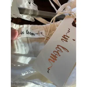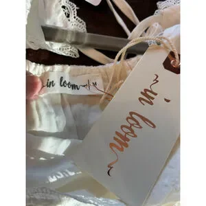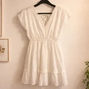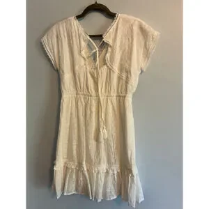 NWT Size Medium in bloom white eyelet and lace baby doll dress. White eyelet fabric edged with lace. Waist has elastic and it ties at the back of the neck. Lines with ruffle at bottom.