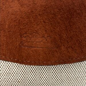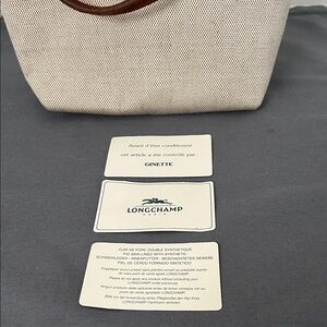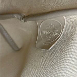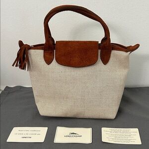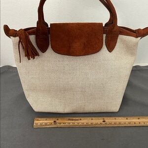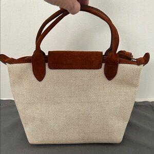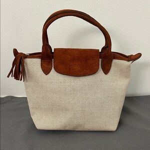 Longchamp women's small tote in cream canvas with brown suede trim and handles. Top snap flap and tassel zipper pull. Lightweight and versatile for everyday use.