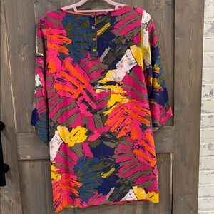 Make a statement in this stunning Tibi mini dress featuring a bold abstract brushstroke print. Set on a vibrant pink base with rich accents of navy, yellow, olive, orange, and cream—this piece is effortlessly eye-catching.