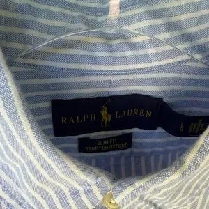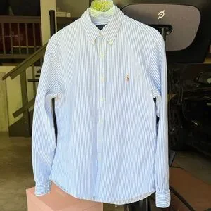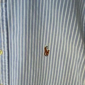 Classic button-down shirt with blue and white vertical stripes. Features embroidered Polo pony on chest. Button collar and full button front. Long sleeves with button cuffs. Timeless preppy styling for everyday wear.
