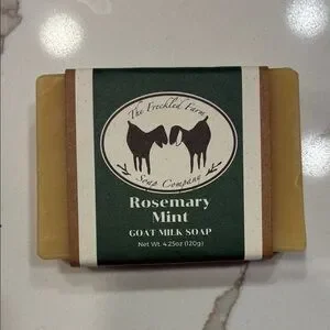 The Freckled Farm Rosemary Mint Goat Milk Soap offers a refreshing rosemary and mint scent. Made with nourishing goat milk for gentle cleansing and moisturized skin. Green packaging highlights the natural, botanical formula.