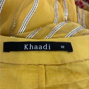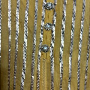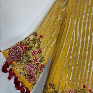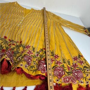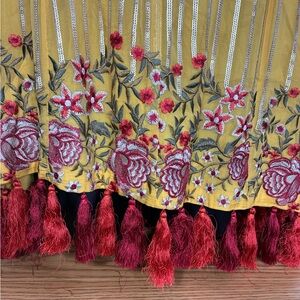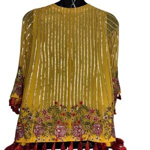 Boho-inspired mustard yellow women's top with intricate floral embroidery and red tassel trim. Lightweight, flowy silhouette with decorative vertical sequin stripes and metal buttons. Stylish for casual or dressy occasions.