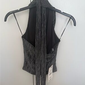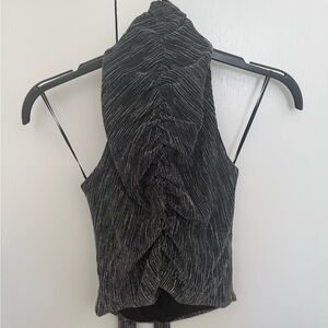 New with tags Zara metallic halter top in size small. Black with silver shimmer stripe detail, open back, and ruched draped back. A great going-out or holiday party top.