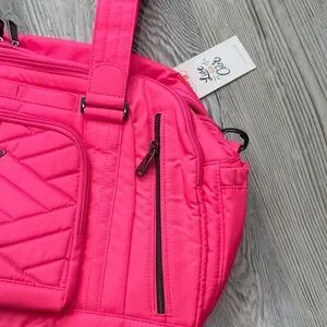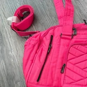 Bright pink lug travel bag with top handles and adjustable shoulder strap. Multiple zip pockets for organized storage. Quilted front panel adds subtle texture. Lightweight design for easy travel.