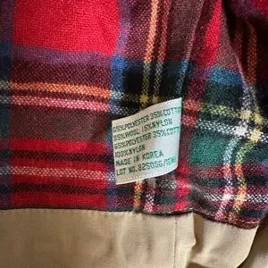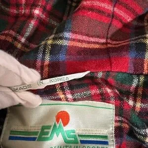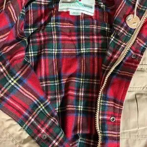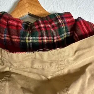 Vintage EMS (Eastern Mountain Sports) hooded parka in classic tan with cozy plaid wool blend lining.