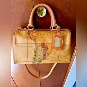 This beautiful new without tags Authentic Alvieri Martini Boston bag features leather coated canvas with rolled leather handles and a detachable shoulder strap which measures 43”. Bag handle drop is 4”. Interior of bag is pristine and has one zipper pocket. Top zipper closure in gold tone hardware all in perfect condition. Includes hanging luggage tag. Attractive Geo map print on exterior in colors tan and brown. Bag measures approximately 11” width x 7” height x 5.5” depth. No notable callouts. Gorgeous bag.