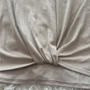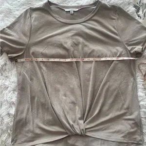 Soft and flattering Green Envelope twist front top in a neutral taupe/beige tone, size XL. This everyday essential features a classic crew neckline and a gathered twist detail at the front hem that creates a slimming, flattering silhouette.
