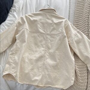Soft cream shacket with a relaxed, oversized silhouette. Button-front closure and dropped shoulders. Simple seam detailing for a clean look. Easy to layer over casual outfits. 100% cotton