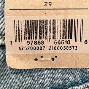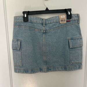 Levi's denim cargo mini skirt in a light blue wash. Features front button closure and belt loops. Casual, easy-to-style piece.