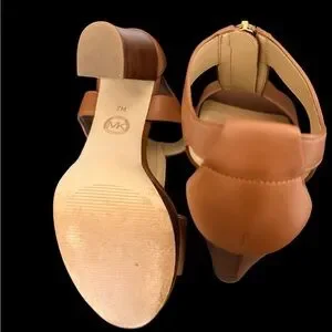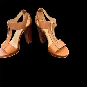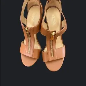 Chic tan leather sandals from MICHAEL Michael Kors. Center zip with gold-tone pull. Slingback strap for a secure fit. Clean, minimalist design for versatile wear.