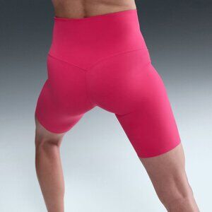 The product is a pair of Women's Nike Zenvy Gentle-Support High-Waisted 8" Biker Shorts in a solid hot pink color. Made from a blend of 63% Nylon and 37% Spandex, these shorts feature a tight fit and elastic waistband for comfort and support. Designed for activewear, they are ideal for gym and training sessions or cross training activities, with features including moisture-wicking and lightweight fabric. The biker style adds a trendy touch to these functional and stylish shorts.