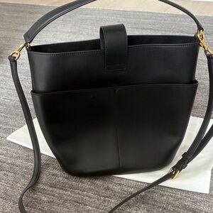 Structured bucket silhouette in smooth black leather. Top strap and detachable long shoulder strap. Front gold-tone clasp and hardware accents. Clean, modern profile for everyday use.