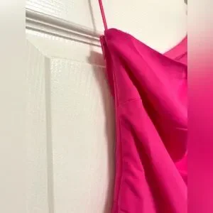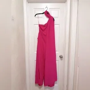 Brand new! The Raspberry Pink Carrie jumpsuit has a one-shoulder silhouette with elegant draping across the body and a long sash down the side. It flows into wide legs, finished with subtle pintucks.