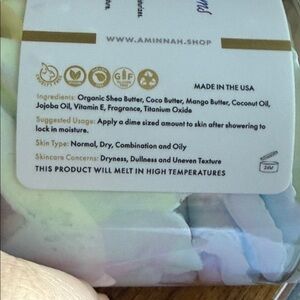 The body butter is a blend of natural and organic oils and butters including coconut oil, cocoa butter, shea butter, and vitamin E.