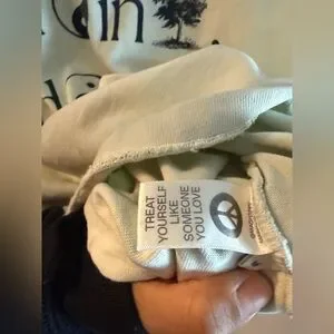 Soft light sage green short sleeve tee. Black graphic text and yin-yang with tree motif repeated down front. Relaxed crew neck fit. Casual, easy wearable style.