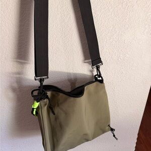 SHEIN crossbody messenger bag. Olive green body with neon yellow braided accent. Adjustable black shoulder strap. Zip closure and lightweight design. Casual and modern look.
