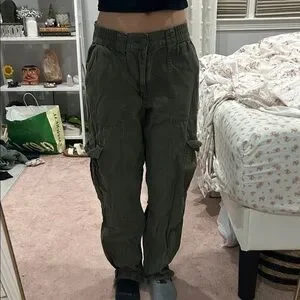 Stylish olive green cargo pants. Features multiple pockets. Comfortable fit.
