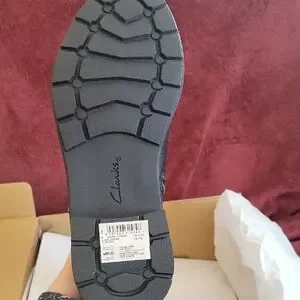 Clarks Black Mid-Calf Heeled Boot with Buckle Accent