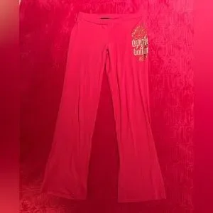 Iconic Apple Bottoms pink flare pants with a fold-over waistband and gold graphic logo on the front. Super flattering bootcut fit with that classic Y2K vibe. Perfect for casual outfits or dressing up.