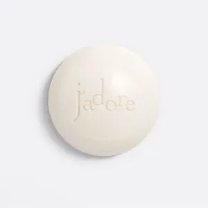 J'adore round soap bar with embossed logo. Smooth cream surface. Elegant minimalist design.