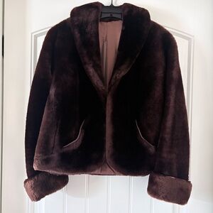 Soft deep brown teddy jacket with a plush faux fur finish. Cozy shawl collar and front pockets for everyday warmth. Easy-to-style silhouette that adds luxurious texture to outfits. Deep brown color enhances a refined, versatile look.