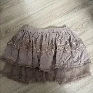 Taupe/brown layered skirt with delicate lace trim and tulle ruffle details. Elastic waistband for comfortable wear. Feminine and versatile design that pairs easily with tops for a polished look.