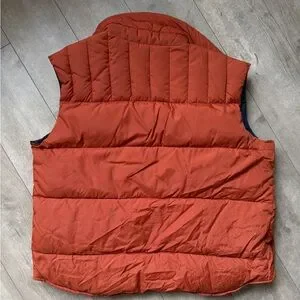 Quilted puffer vest in rust orange with contrasting navy interior. Snap-front closure and front flap pockets. Stand collar for added warmth. Lightweight layering piece for casual wear.