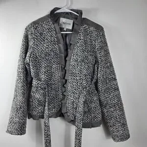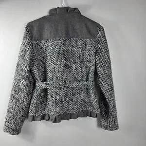 Keywords: tweed jacket, womens blazer, wool blend jacket, Oleg Cassini, belted jacket, gray jacket, size 2, professional attire, career wear, classic jacket, retro jacket, ruffle trim jacket, formal jacket, womens outerwear