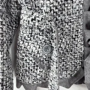 Command attention with this sophisticated tweed jacket, an embodiment of timeless elegance and modern design. An exquisite wool-blend tweed creates a tactile richness with a textured, multi-tonal pattern. The jacket is tailored with a flattering silhouette featuring a notched lapel and a self-tie belt, accentuating the waist. A ruffle detail runs down the front of the jacket, adding to the overall appeal. The solid contrast detailing on the shoulders and trim of the jacket create visual interest, and the jacket features pockets, which add functionality. Perfect for a business meeting, a chic brunch, or a sophisticated evening out, this belted jacket will undoubtedly elevate your wardrobe with its distinctive charm.