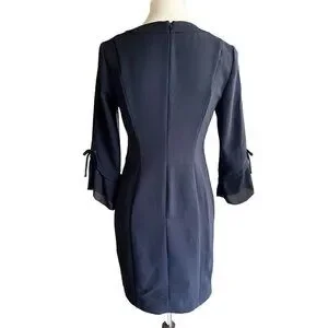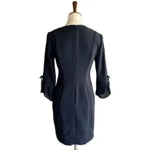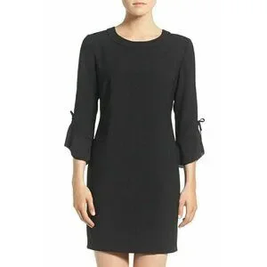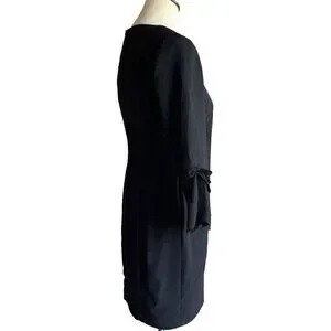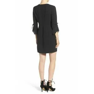 Ruffled sleeves bedecked with bow accents contrast the sleek, minimalist silhouette of a versatile LBD seamed through the waist for figure-defining shape.