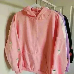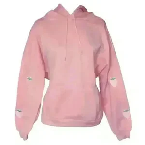 Soft, cute, and comfy oversized hoodies with strawberry sleeve detail.