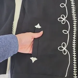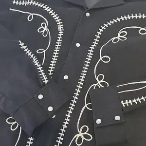Made just like the 50s original, gabardine twill is 100% cotton, a year a round weight. Beautifully chain stitch embroidered on front, back and sleeves with lining, stylized snap treatment on front and pockets with embroidered arrowheads. This is not mass produced, they take time to make by hand.