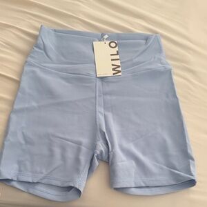 Soft, stretchy bike shorts in a sky blue hue. High-rise waistband for a secure fit. Smooth, form-flattering silhouette. Great for workouts or casual wear.